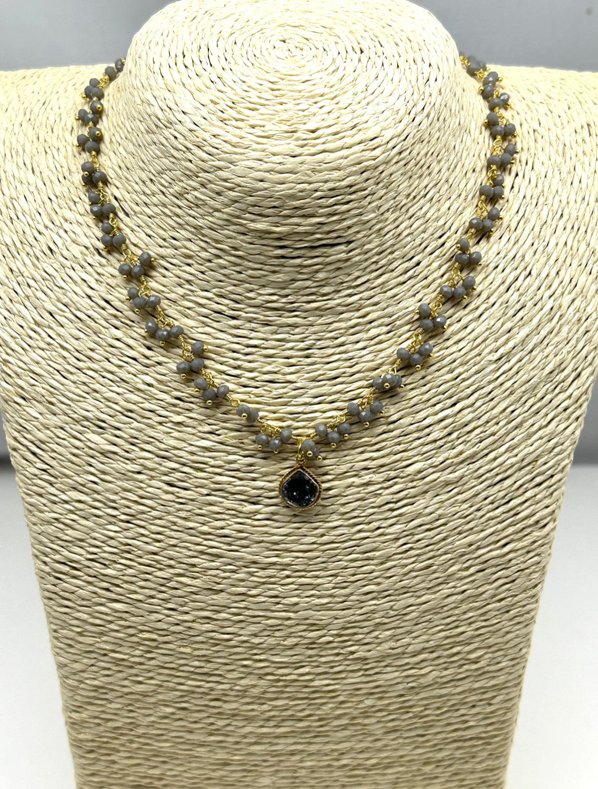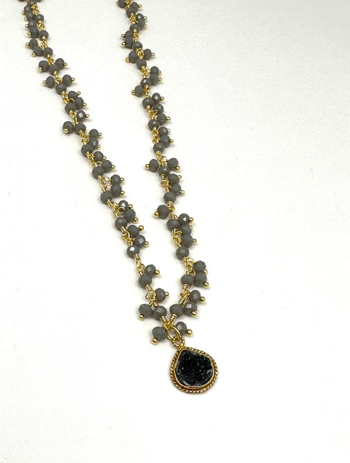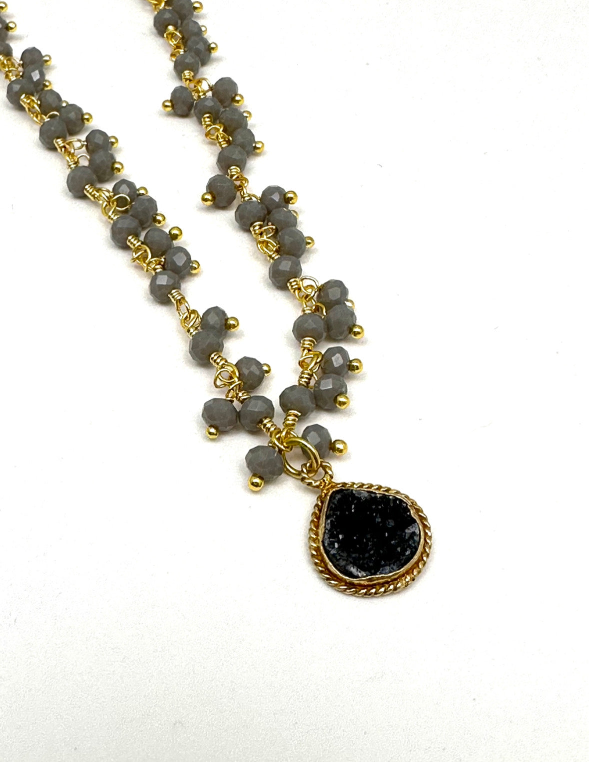 Grey Rosary Bead Chain with Black Geode Gemstone