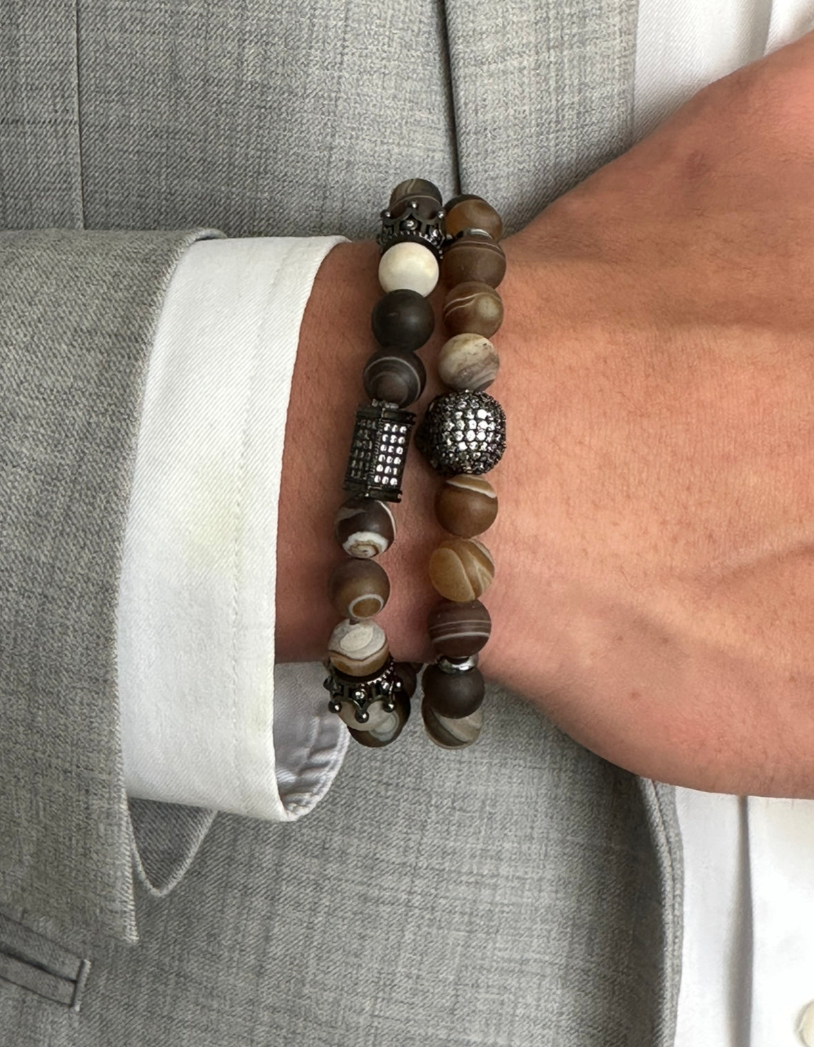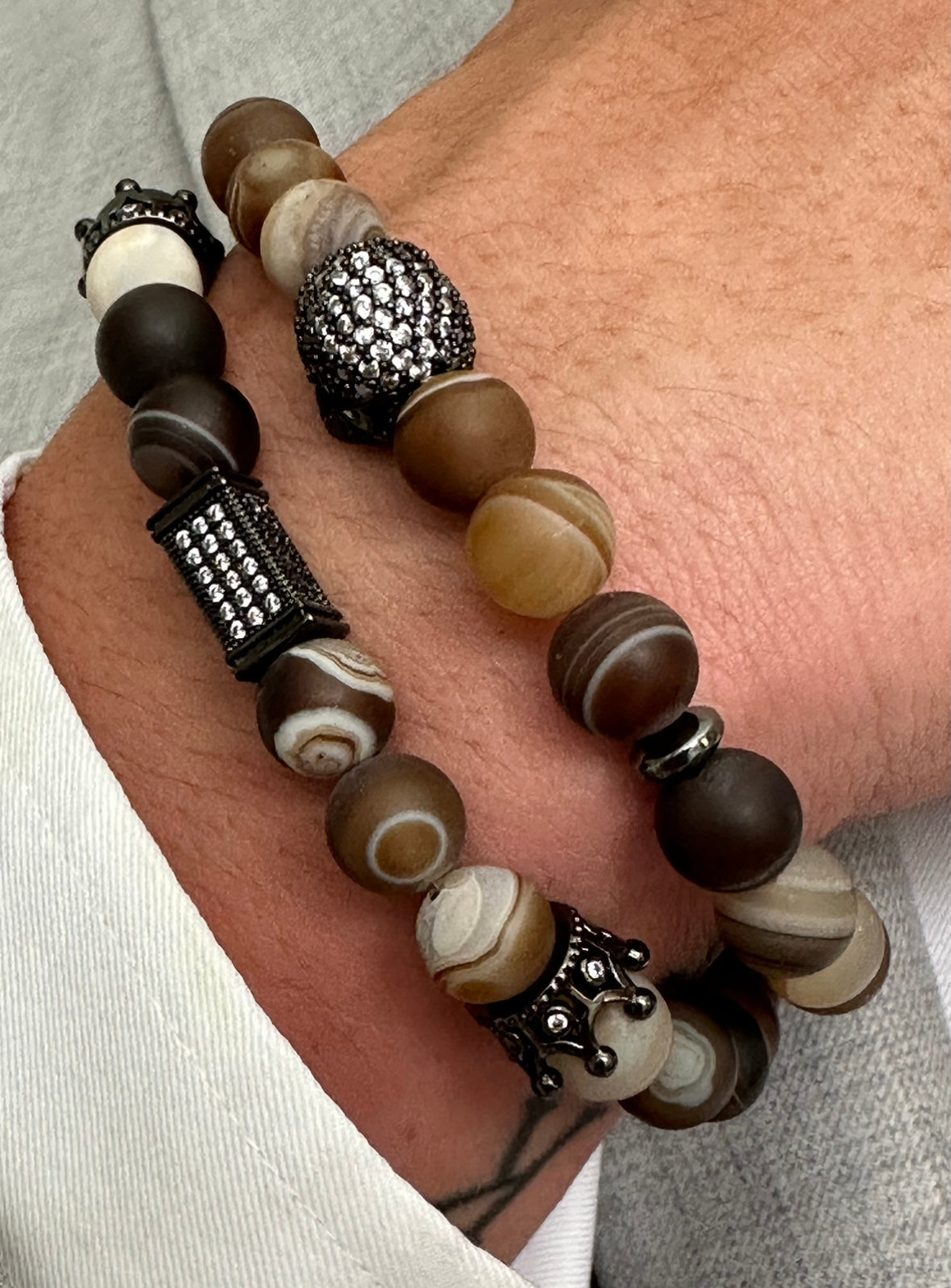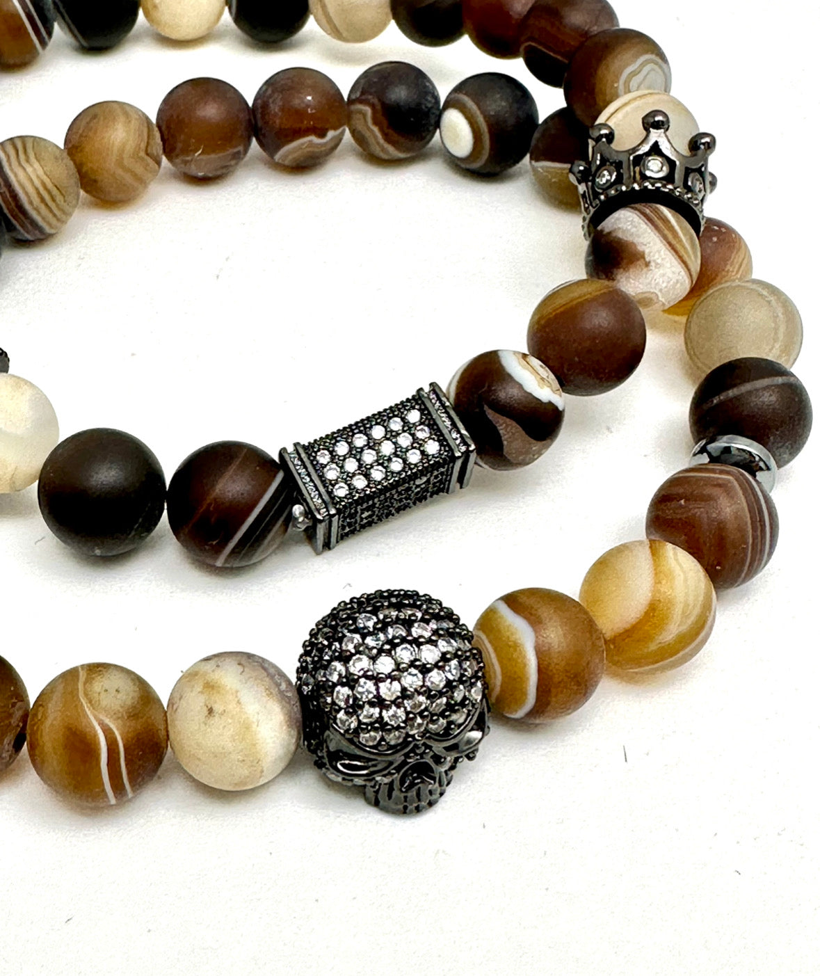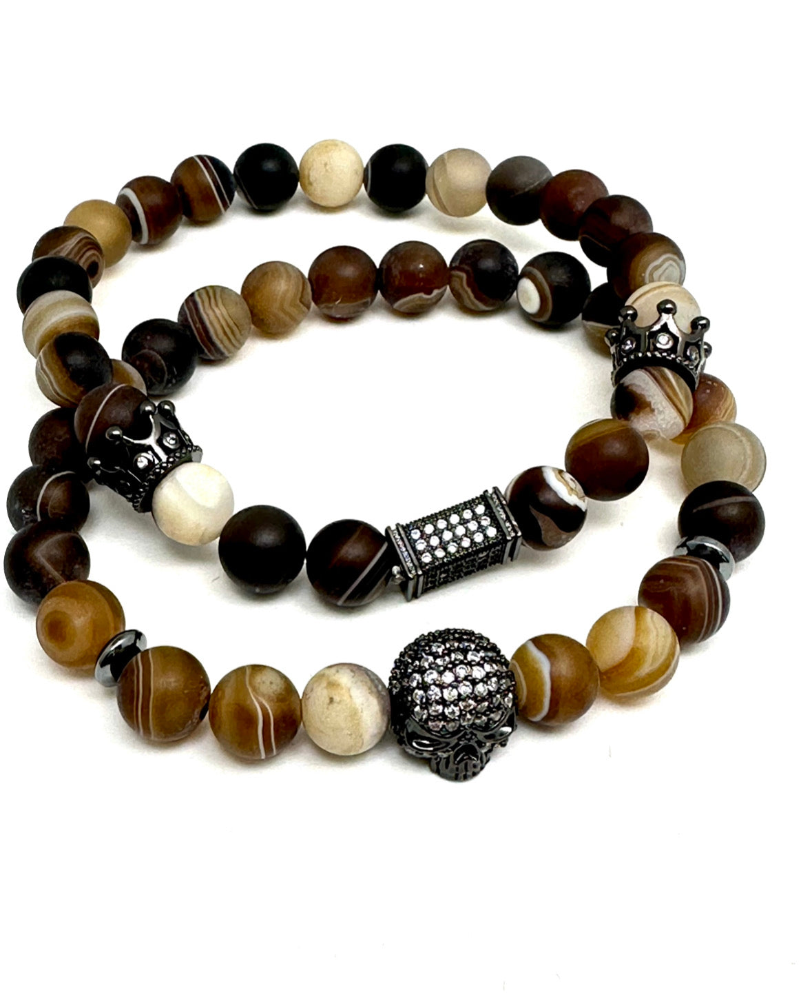 Men’s Brown Malachite Beaded Bracelet with Gunmetal Skull and Crown
